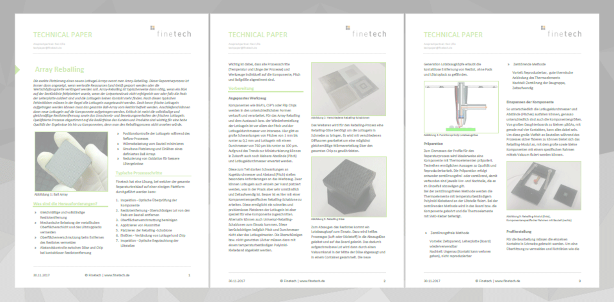 Zusammenfassung: Die exakte Platzierung eines neuen Lotkugel-Arrays nennt man Array-Reballing. Dieser Reparaturprozess ist immer dann angezeigt, wenn wertvolle Ressourcen (und Geld) gespart werden oder die Wertschöpfungskette verlängert werden soll. Array-Reballing ist typischerweise dann nötig, wenn ein BGA auf der Bestücklinie fehlplatziert wurde, wenn der Lotpastendruck nicht erfolgreich war oder falls die Pads der Leiterplatte oxidiert sind und die Lotkugeln keinen Kontakt mehr finden. Bei diesen typischen Fehlerbildern müssen in der Regel alle Lotkugeln ausgetauscht werden. Bevor jedoch frische Lotkugeln aufgetragen werden können, muss das gesamte Ball-Array vom Restlot befreit werden. Anschließend können dann neue Lotkugeln auf die Komponente aufgetragen werden. Kritisch ist meist die vollständige und gleichmäßige Restlotentfernung sowie das Umschmelz- und Benetzungsverhalten der frischen Lotkugeln. Qualifizierte Prozesse, abgestimmt auf die Bedürfnisse des Kunden und Produkte, sind wichtig für eine hohe Qualität der Ergebnisse. Nur dann stehen am Ende Komponenten in Erstausrüsterqualität.