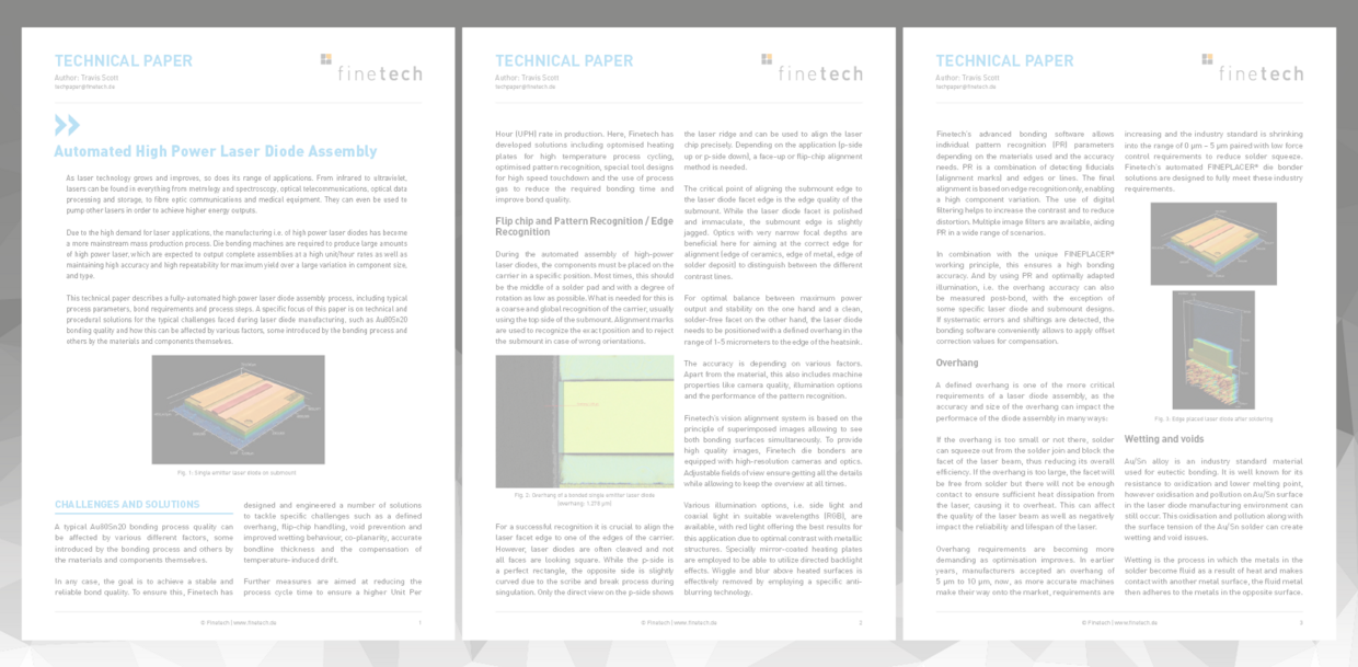 In diesem Technical Paper wird ein vollautomatischer Prozess zur Montage von Hochleistungslaserdioden beschrieben, einschließlich typischer Prozessparameter, Bondanforderungen und Prozessschritte. Ein besonderer Schwerpunkt dieses Papiers liegt auf technischen und verfahrenstechnischen Lösungen für die typischen Herausforderungen bei der Herstellung von Laserdioden, wie z. B. die Qualität der Au80Sn20-Bondung, und wie diese durch verschiedene Faktoren beeinflusst werden kann, etwa durch den Bondprozess selbst oder durch die verwendeten Materialien und Komponenten.
