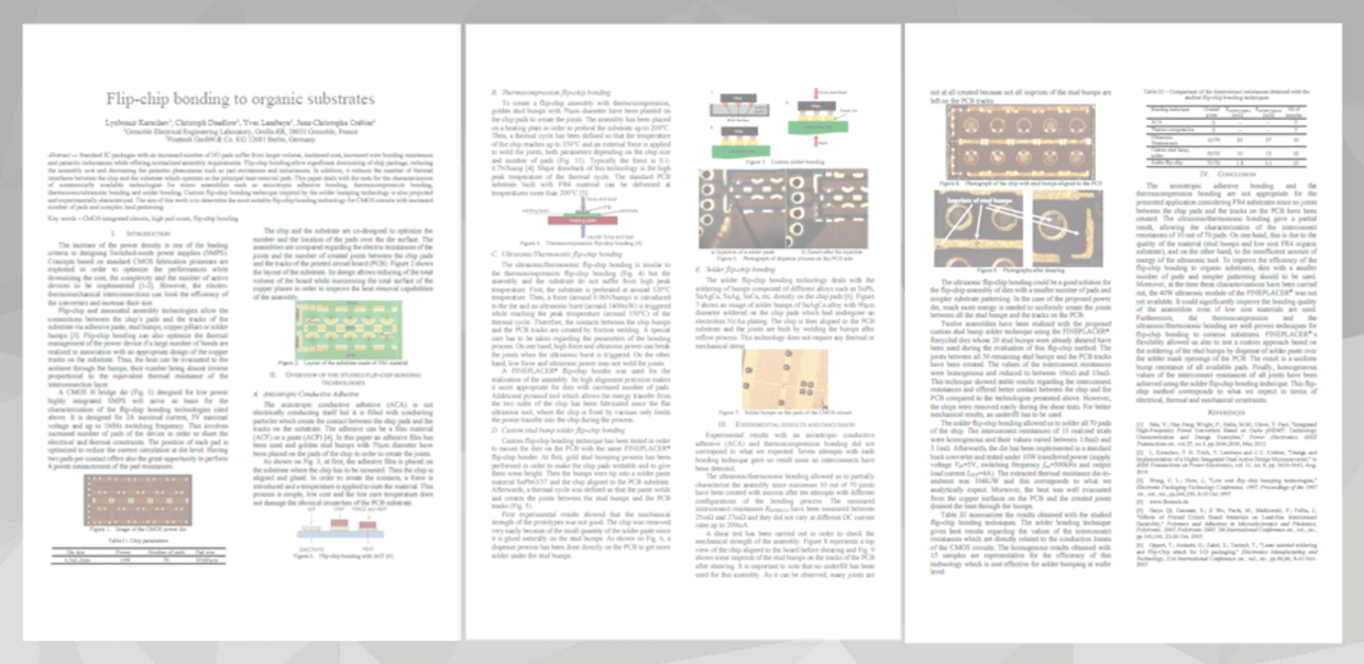 Zusammenfassung: Standard-IC-Schaltungen mit einer erhöhten Anzahl an I/O Pads sind bei normierten Montageanforderungen größer, teurer und weisen erhöhte Widerstände beim Wirebonden sowie parasitäre Induktivitäten auf. Mit Hilfe des Flip Chip Bondens kann das Chip-Package deutlich kompakter gehalten werden, was die Montagekosten senkt und unerwünschte parasitäre Phänomene wie Widerstand und Induktivität der Pads verringert. Zusätzlich kann die Anzahl der Wärmeschnittstellen zwischen Chip und Substrat, die als hauptsächlicher Pfad für die Wärmeabfuhr dienen, kleiner gehalten werden. Das Paper stellt Tests zur Einschätzung kommerziell verfügbarer Mikromontagen wie anisotropische Klebetechnologien, Thermokompressionsbonden, Thermosonisches / Ultraschallbonden und Löten vor. Auch speziell entwickelte Flip-Chip-Techniken, die am Solder Bumping angelehnt sind, werden vorgeschlagen und experimentell beschrieben. Ziel dieser Arbeit ist es, die geeigneteste Flip-Chip-Bondtechnologie für CMOS Schaltkreise mit erhöhter Padzahl und komplexer Oberflächenstrukturierung zu ermitteln.