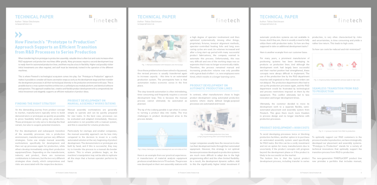 Hier setzt Finetechs technologisches Ökosystem an, um diesen Widerspruch aufzulösen. Unser „Prototype to Production“ – Ansatz ermöglicht es, auf Basis einer systemübergreifenden Maschinenarchitektur, einer vereinheitlichten Prozessmodulplattform sowie identischer Software und Bedienung bereits in der Entwicklung alle Automatisierungsschritte vorzudenken und anschließend alle Entwicklungsprozesse unkompliziert in ihrer gesamten Vielfalt in die Produktionsumgebung zu transferieren.