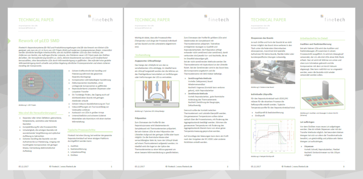 Zusammenfassung: Finetech‘s Reworksysteme für F&E und Produktionsumgebungen unterstützen den vollständigen Reparaturkreislauf für Kleinst-LED, wie man sie z.B. in Form von LED Tripeln (RGB) bei modernen Displaytechnologien findet. Unterstützt werden sämtliche benötigte Arbeitsschritte wie das Auslöten einer oder mehrerer defekter LEDs aus dem Verband, das Entfernen von Restlot, das Auftragen frischer Lotpaste sowie das Platzieren und Einlöten der neuen LED. Die Herausforderung besteht u.a. darin, kleinste Bauelemente aus einem Mini-LED- Großverband herauszulöten, ohne benachbarte LEDs durch das Aufheizen zu gefährden. Dies erfordert eine gezielte Wärmeeinbringung durch schnelle und präzise Regelung sämtlicher Prozessparameter und ein sicheres Handling der Komponente.
