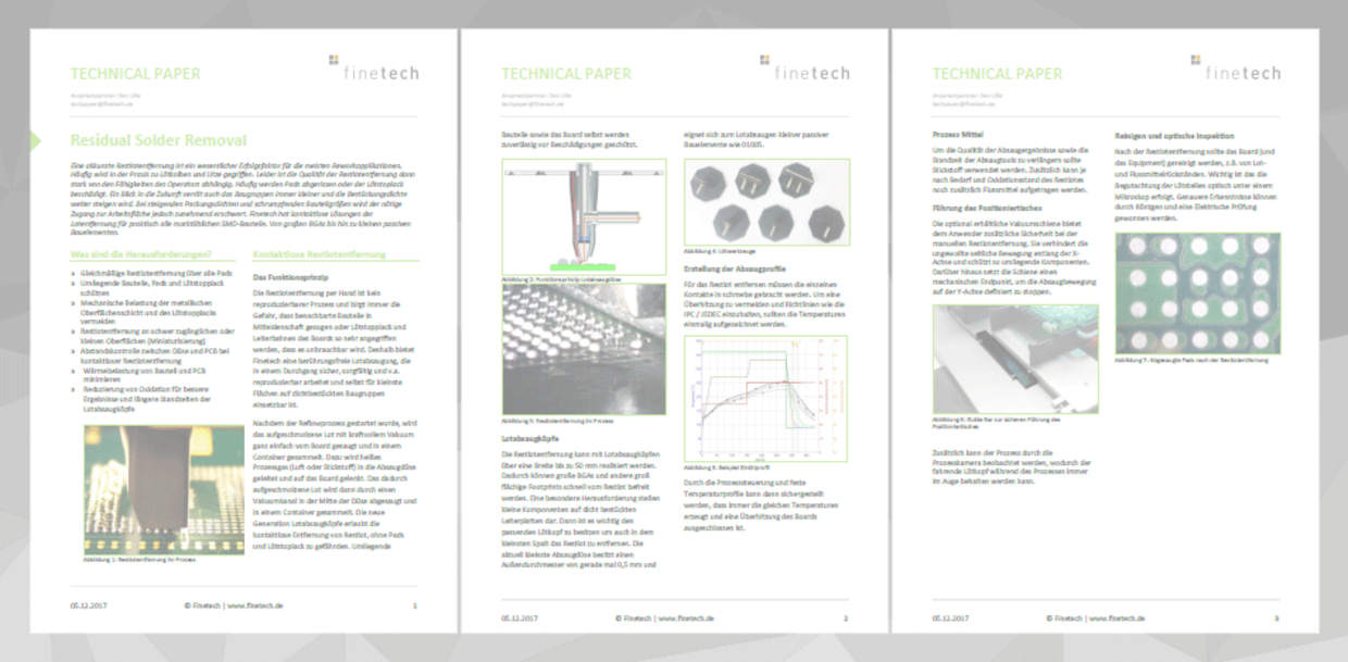 Zusammenfassung: Eine akkurate Restlotentfernung ist ein wesentlicher Erfolgsfaktor für die meisten Reworkapplikationen. Häufig wird in der Praxis zu Lötkolben und Litze gegriffen, leider ist die Qualität der Restlotentfernung dann stark von den Fähigkeiten des Operators abhängig. Häufig werden Pads abgerissen oder der Lötstopplack beschädigt. Ein Blick in die Zukunft verrät zudem, dass Baugruppen immer kleiner werden und die Bestückungsdichte weiter steigt. Bei zunehmenden Packungsdichten und schrumpfenden Bauteilgrößen wird der nötige Zugang zur Arbeitsfläche jedoch zunehmend erschwert. Finetech hat kontaktlose Lösungen der Lotentfernung für praktisch alle marktüblichen SMD-Bauteile von großen BGAs bis hin zu kleinen passiven Bauelementen.